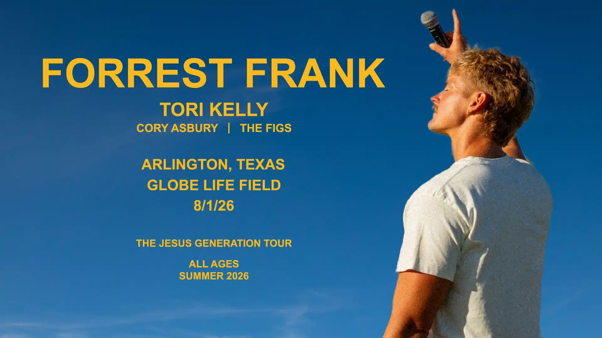 JUST ANNOUNCED! Forrest Frank: The Jesus Generation Tour is headed to Globe Life Field on Saturday, August 1, 2026! A can’t-miss Worship Experience with special guests Tori Kelly, Cory Asbury, and The Figs.